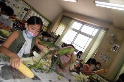 今日は3年生がトウモロコシの皮むきをしてくれました。