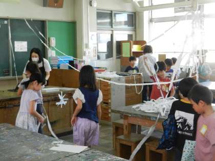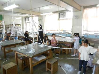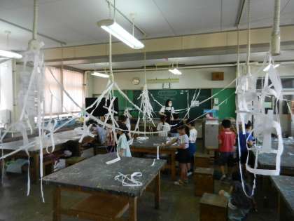細長いテープが図工室の天井から吊り下げられています。面白そう!