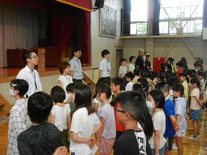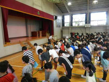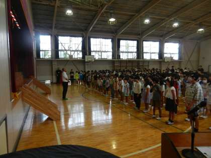 全校児童が集まっています。2学期の始業式です。