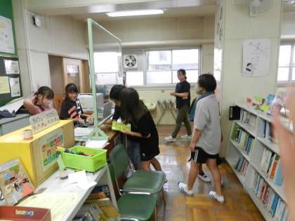 図書室の本を整頓します。休み時間は本の貸出も行います。