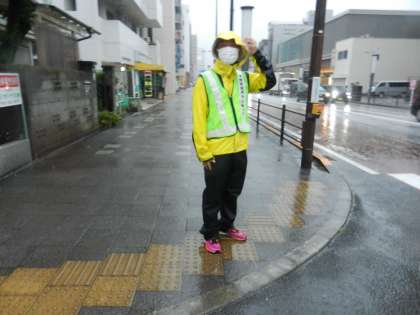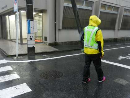 黄色の雨具が目立ちます。周囲の視線を集めます。これがいいのです。さすがです!