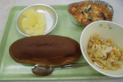☆今日の献立 黒糖パン 秋なすと豆腐のグラタン パリパリアーモンドサラダ りんご缶 牛乳