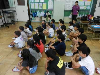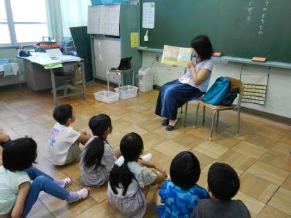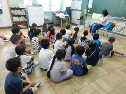 1年2組の様子です。図書ボランティアの方による読み聞かせです。