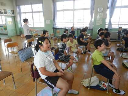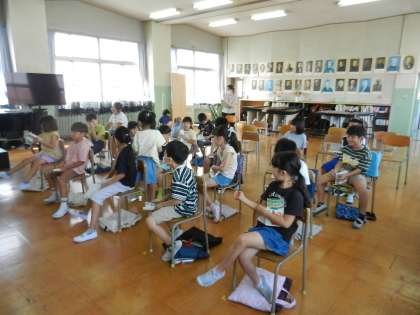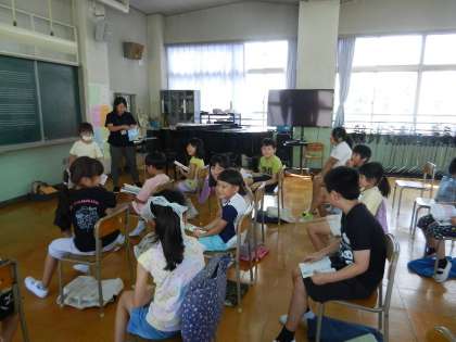 2年生が学習中です。単元名は「虫のこえ」です。虫のこえに合った楽器をえらび、歌のあわせて鳴らすことがねらいです。