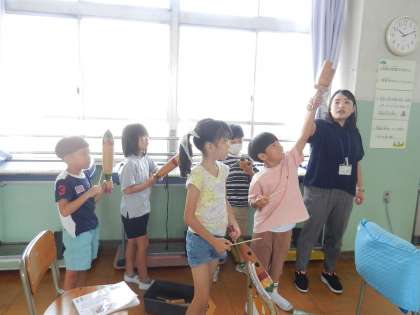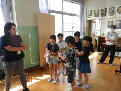 マツムシ、すずむし、こおろぎ、クツワムシ、うまかい。それぞれの虫の声に合う楽器を考えます。