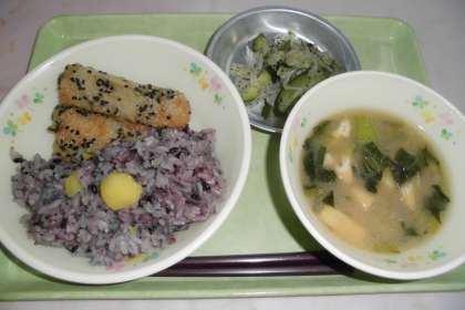 ☆今日の献立 秋月ごはん 石垣揚げ ゆかりあえ 八王汁 牛乳