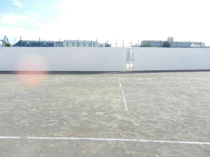 中学校に到着すると、校庭にはいくつもの塀が立てられていました。