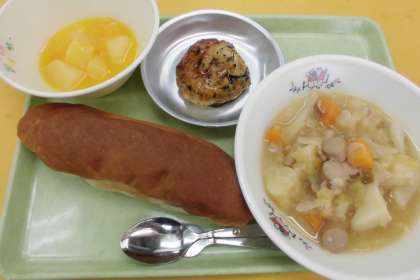 ☆今日の献立 米粉パン つくねバーグ はっちくんのポトフ オレンジポンチ 牛乳