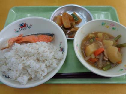 ☆今日の献立 ごまごはん 鮭の塩焼き 肉じゃが きゅうりと大根の南蛮漬け 牛乳
