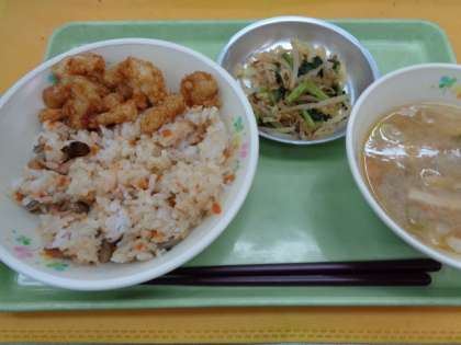 ☆今日の献立 きのこごはん いかのかりんとあげ 豚汁 野菜のおかか和え 牛乳
