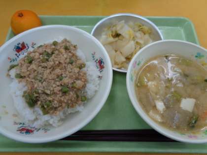 ☆今日の献立 そぼろ丼 ごじる 八王子産ゆずの香り和え みかん 牛乳