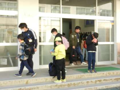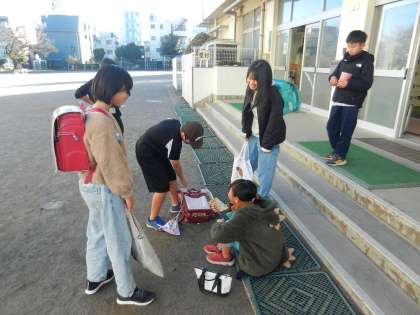 朝、3つの昇降口の前で代表委員の子供たちが募金箱を持ち立ちます。