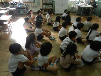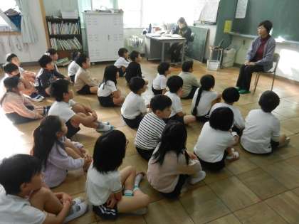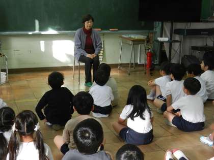 子供たちが教室の前方に集まっています。八王子おはなしの会の方々による「おはなし会」です。