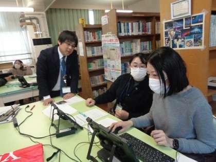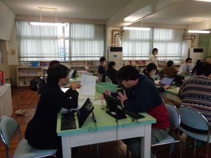 第二小学校の教員と第四中学校の教員が集まっています。研究発表会に向けた準備です。