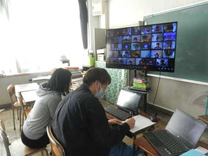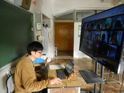 タブレット型学習用端末や大型液晶モニターには子供たちの顔が映っています。