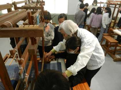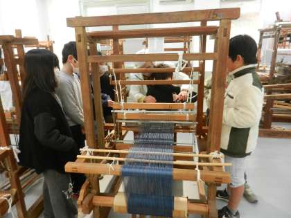 1組は織物体験を行いました。本物の機織り機です。伝統工芸士の方が講師です。
