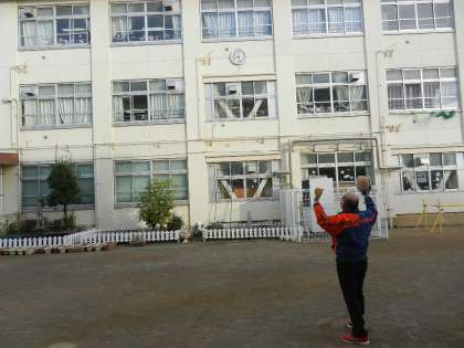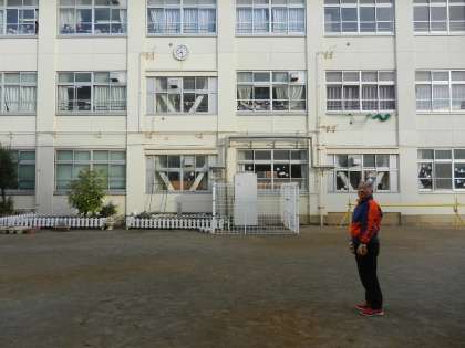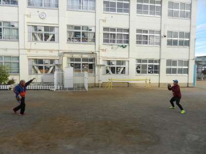 中庭で学校長と体育主任でキャッチボールをしました(中庭でのボール遊びは禁止です。子の時だけ特別です)。