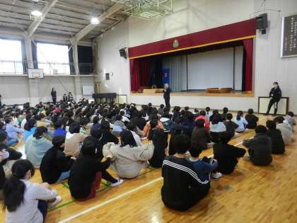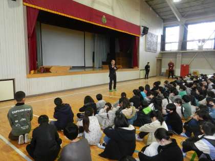 全校児童は話し手の方を見ながらちゃんと聞いています。素晴らしいです。