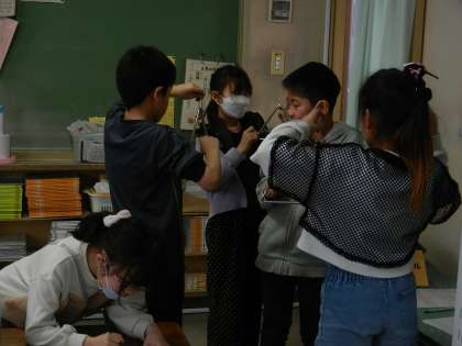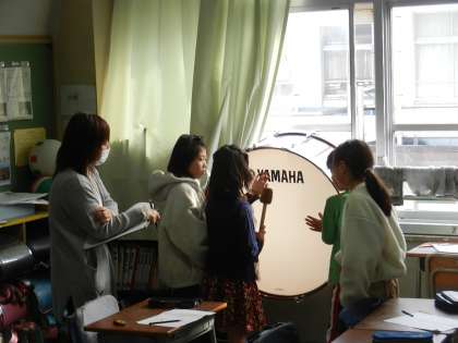 教室の端には、様々な楽器が設置されています。トライアングル、シンバル、フロアタム、コンガ、大太鼓です。