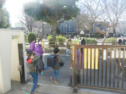 黄色の帽子をかぶった1年生に続いて、2年生が下校します。