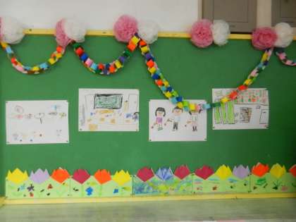 教室の壁や廊下の壁には、現2年生(昨年度の1年生)が描いた絵が飾られています。1年間の教育活動が描かれています。すてきです。