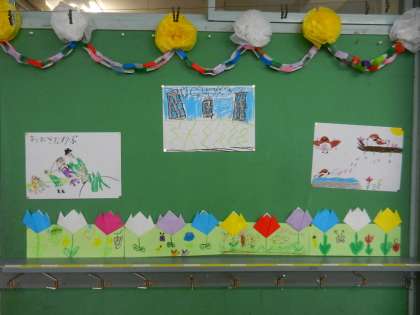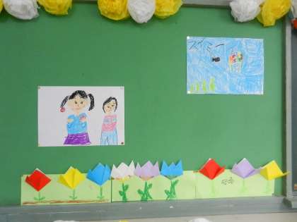 黒板に飾られた「にゅうがくおめでとう」の文字が華やかです。