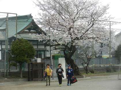 きれいなピンク色です。天候にも恵まれました。青空の下、校庭で始業式を行いました。