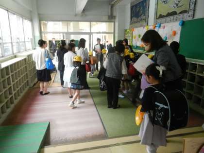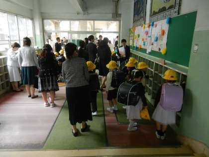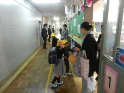 保護者の方々が教室に入ります。子供たちはほっとした表情に変わります。