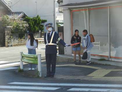 笛の音が響きます。横断歩道や交差点等に交通安全協会の方々が立っています。