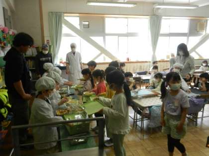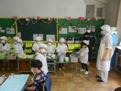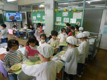 給食当番の配膳は他のグループの子供たちが行います。全ての配膳が終わりました。