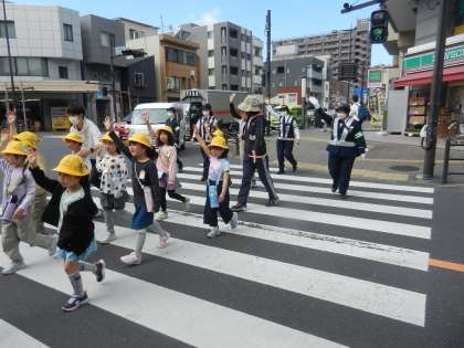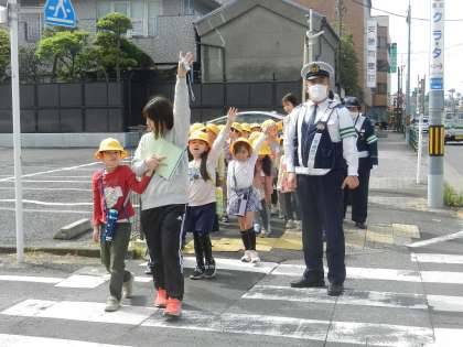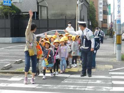 警察官が子供たちの行動を見守ります。上手にできたかな?