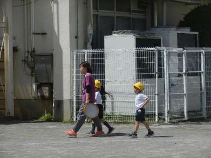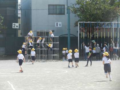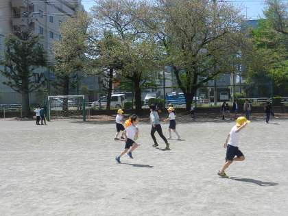 黄色い帽子をかぶった1年生が元気に運動しています。