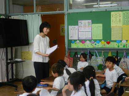 声の出し方、読む速さ、声の大きさ等、子供たちに分かりやすく抑揚を付けます。