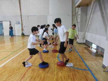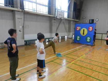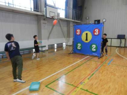 校庭の固定施設(ジャングルジム、壁あて、幅跳び用砂場)、体育館では柔軟性・投力を高めたり体幹を向上させる道具を準備しています。