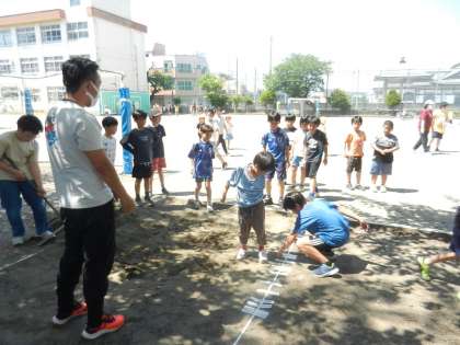 青空の下、子供たちが思い切り体を動かします。楽しそうです。