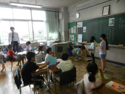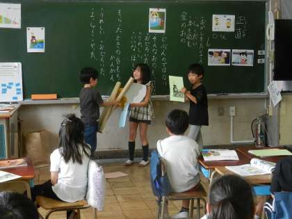 グループごとに発表します。子供たちの手には台本があります。