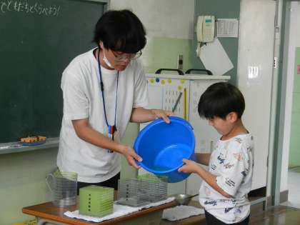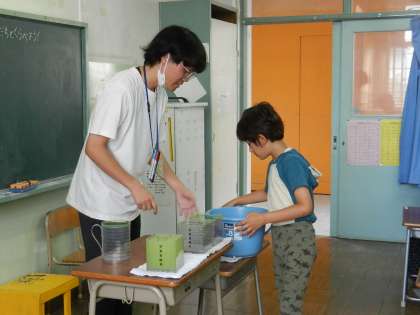 単元名は「水のかさ調べ」です。バケツと1Lの容器を使ってかさを測り、1Lの量感を身に付けることがねらいです。