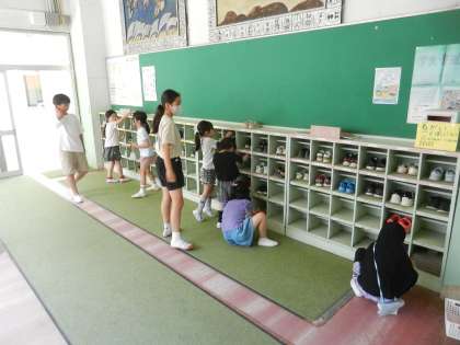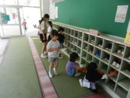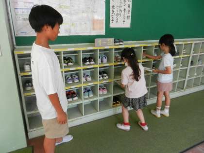 靴箱も1年生が清掃を行います。小さいほうきと小さいちりとりを準備します。