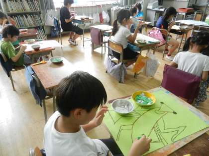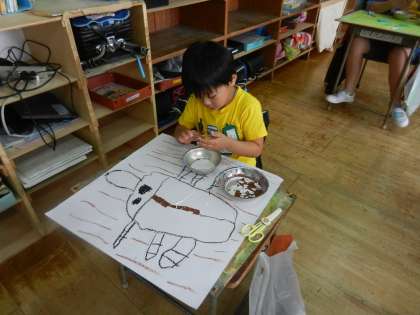 子供たちの下絵は、ものすごく上手です。画用紙に大きく描いています。中には画用紙を2枚張り合わせて、さらに大きな下絵を描いている子供もいます。すごい!