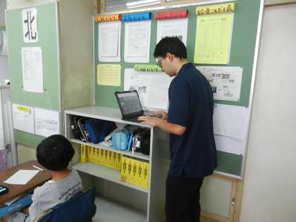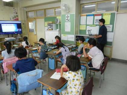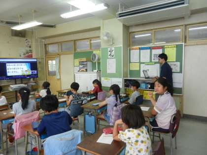 学校長の話に続いて、情報教育担当の先生からパソコン(クロームブック)の使い方について説明しました。