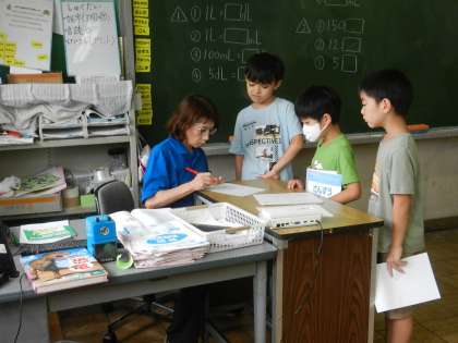 プリントをやり終えた児童は、先生に見せます。個別指導の時間です。