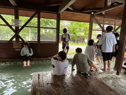 子供たちの中には、すごーく熱いお湯にチャレンジする子も…。足湯から上がると、足首から足の指先まで真っ赤になっていました。