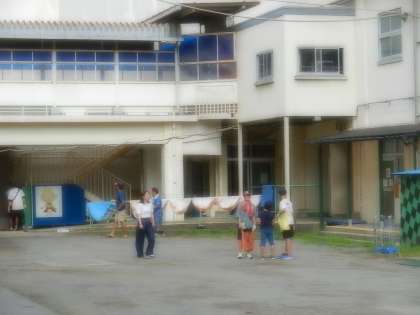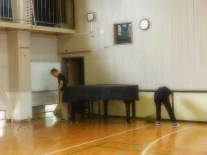 ラジオ体操が終わると、学校清掃に取り掛かります。校庭と体育館を清掃します。