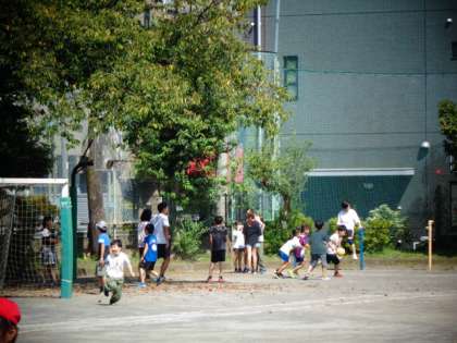 走る、逃げる、と言う分かりやすいルールで、誰もができる運動(走る)、大勢の人数でも運動できる…。校庭をいっぱいに使って走っています。
