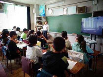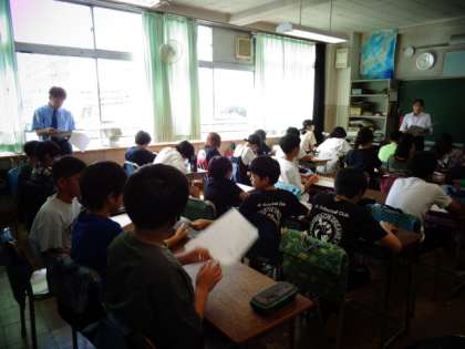 授業をすすめるのは、栄養教諭として第二小学校で実習を行っている大学生です。
