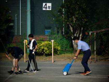 先生方が校庭で作業をしています。