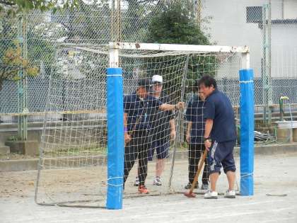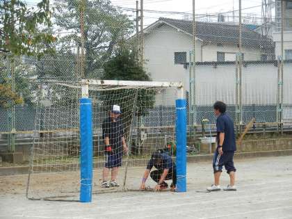 サッカーゴールを固定します。杭打ちは教職員で行います。