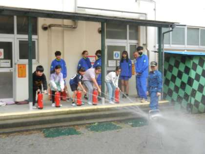 体育館の下では、初期消火、煙体験ができました。南校舎の廊下では、バケツリレーを行いました。
