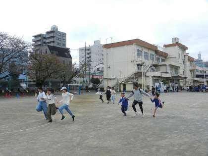 プログラム1番は、みんなで徒競走です。3人一組で手をつなぎ、仲よく校庭を走ります。転ばないように、あわてないでね!