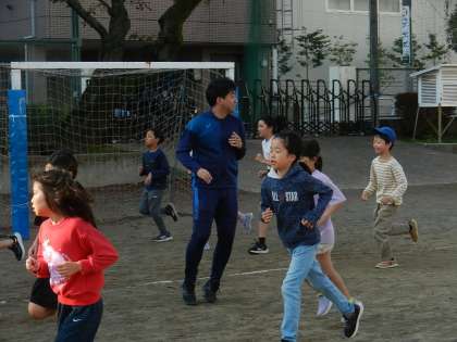 見守りをする先生、子供たちと一緒に走る先生。